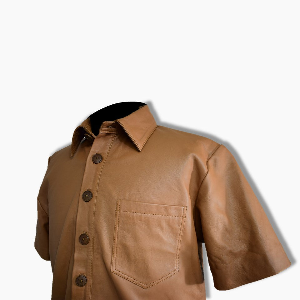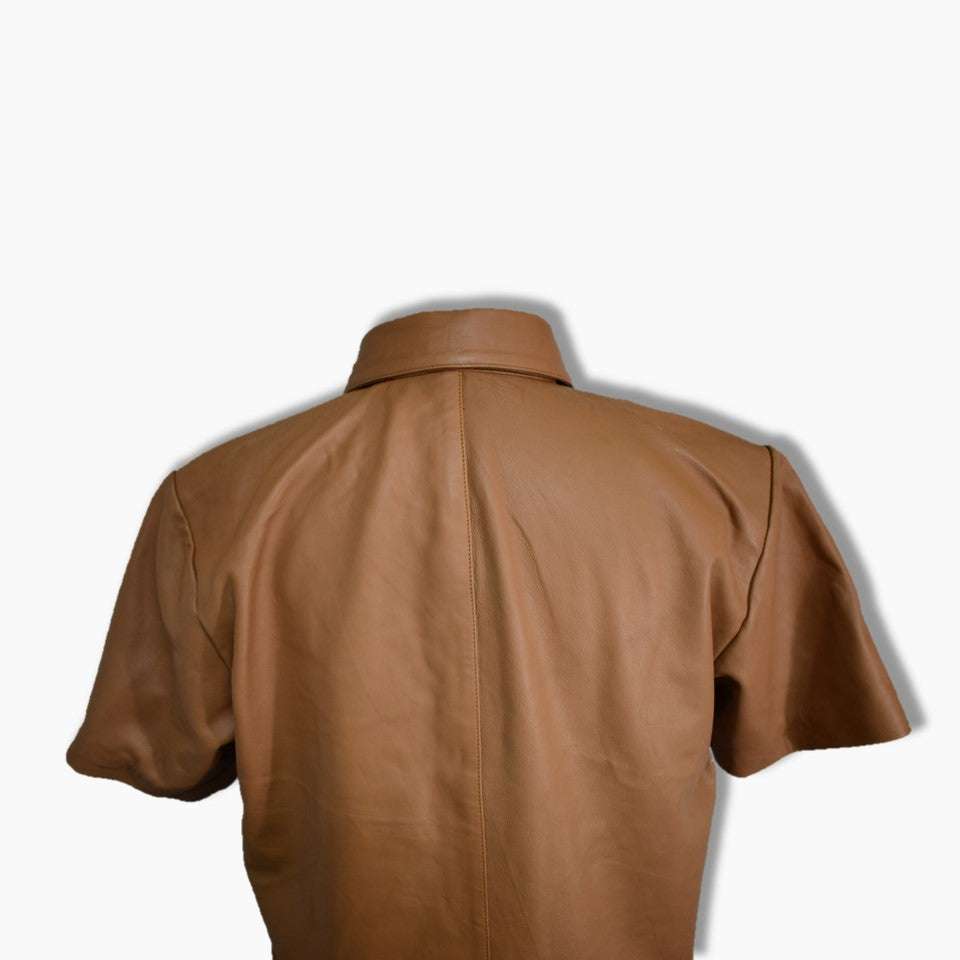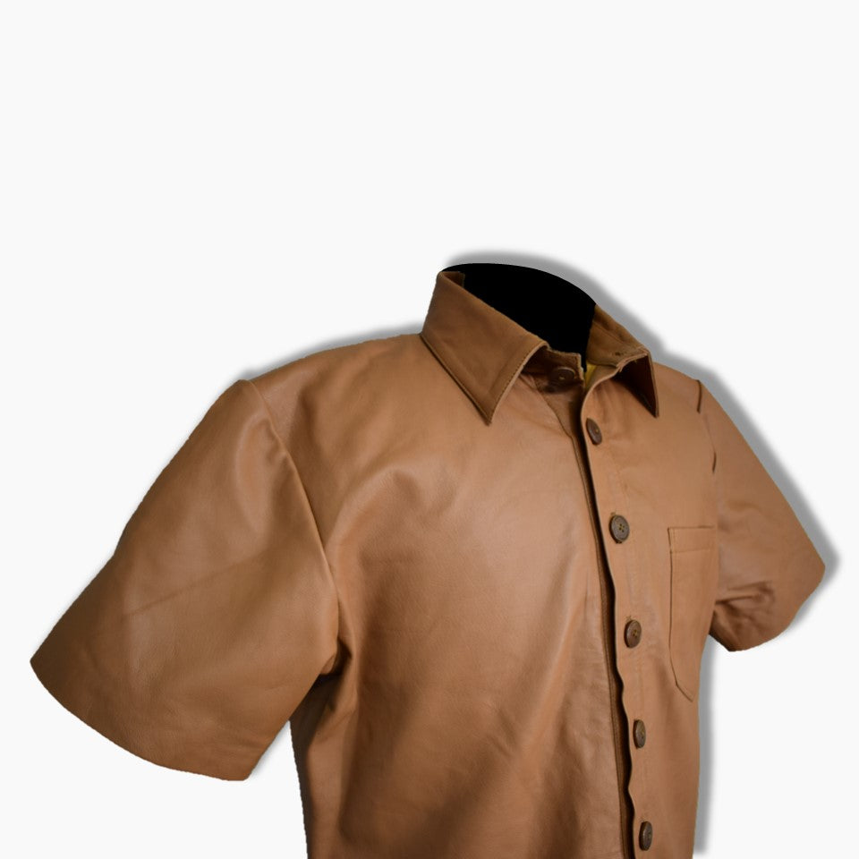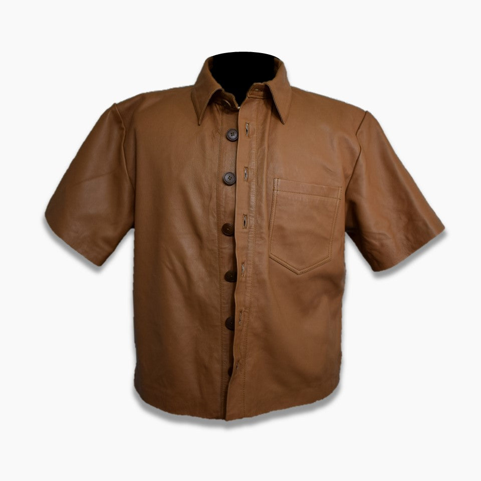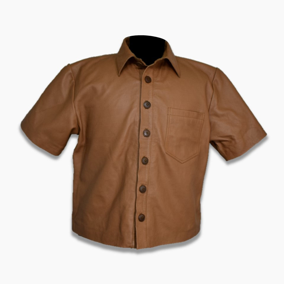 Unisex Brown Leather Button Down Shirt in Short Sleeves